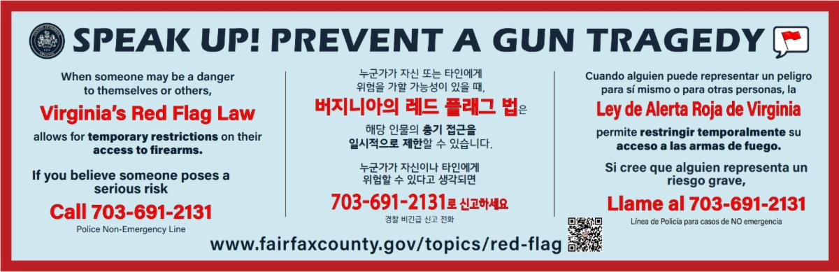 Fairfax County has relaunched our Red Flag Law awareness campaign to help residents better understand how this important tool works and the role it plays in keeping our community safe. The campaign focuses on increasing awareness of Emergency Substantial Risk Order (ESRO) which are temporary, court-reviewed measures used during moments of serious risk to prevent harm before it happens. | |