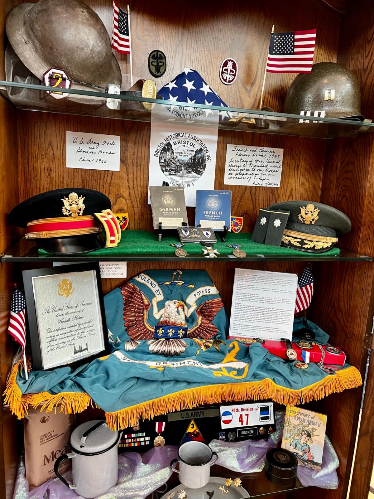 The Bristol Historical Association is proud to announce a newly installed exhibit at the Bristol Public Library featuring American Militaria. This patriotic collection consists of items on loan from several local Army veterans.