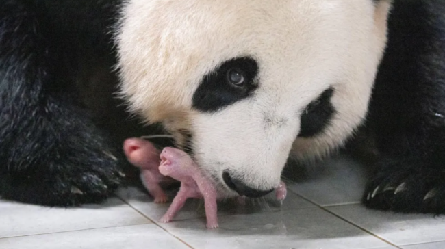 Video posted to YouTube showed their mother Ai Bao picking up the first cub, weighing 180 grams (6 ounces), with her mouth, then delivering the second cub, weighing 140 grams, an hour later.