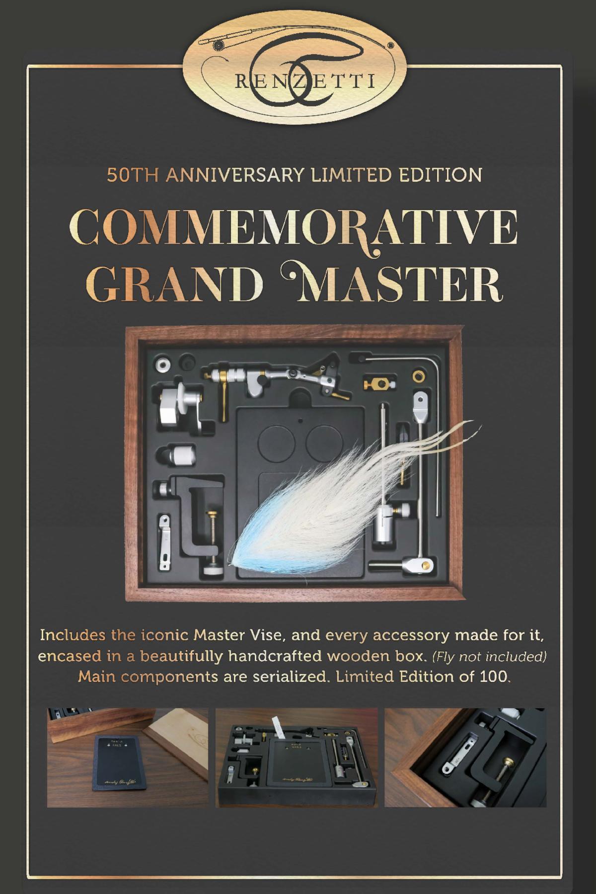 The Commemorative Grant Master Series stands as a tribute to the timeless craftsmanship and innovation of the iconic Master Vise, first introduced in 1993 and now exquisitely hand polished to preserve its original charm. This exceptional collection is enriched with a variety of thoughtfully designed accessories, many of which reflect the invaluable insights from renowned figures in the fly fishing community, including the late Lefty Kreh, David Whitlock, and Bob Popovics, Bob Clouser Nick Curcione and Rusty Gates. Each set features a C-clamp lap extension, a C-clamp, an AuSable speed crank, a Clouser minnow arm, a spinning attachment, a streamer pedestal bench, a 3-inch stem extension, and midge jaws, all meticulously crafted for functionality and elegance.