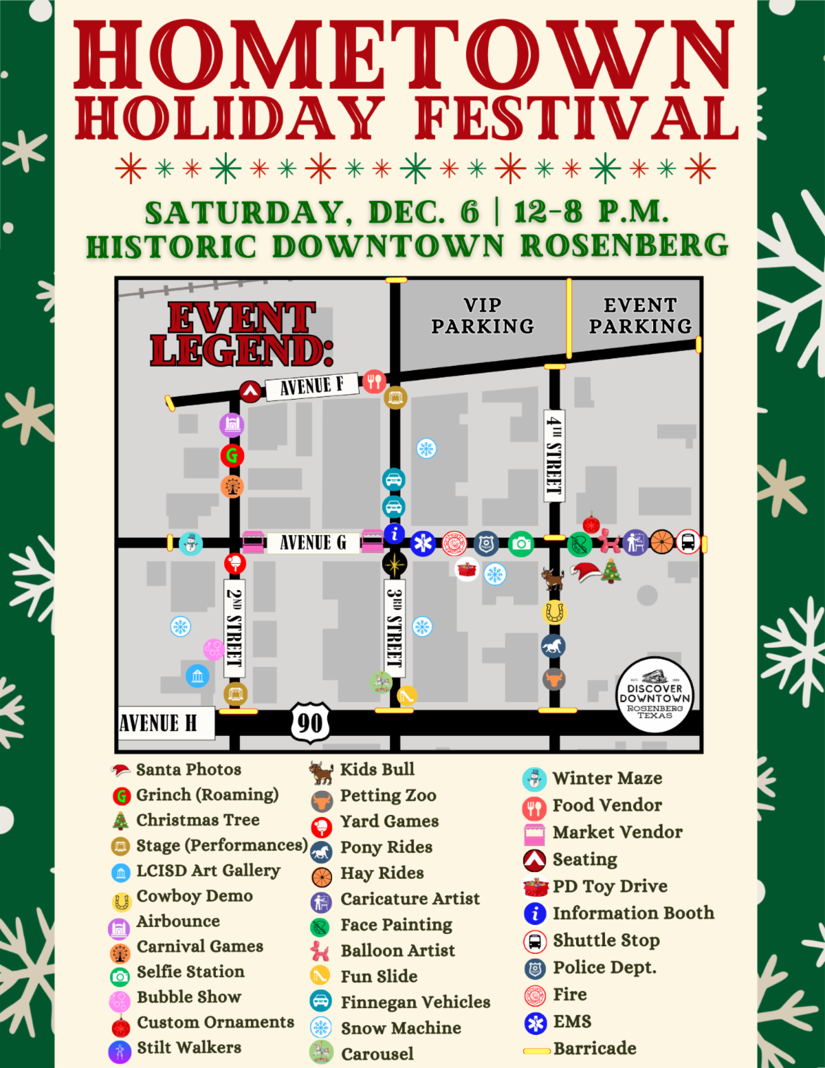 Activities occurring for the duration of the event include: Lamar CISD Art Gallery and Show, Photobooths, Santa Photos, Fun Slide, Carousel, Selfie Stations, Air Bounces, Carnival Games, Yard Games, The Grinch, Food Vendors, Market Vendors, Holiday Hay Rides, Stilt Walkers, Petting Zoo, Pony Rides, Bubble Show, Bull Rides, 3D Chalk Art Show, Winter Maze, Toy drive for Rosenberg Police Department, Sparky Team and Special Activities inside participating downtown merchants stores.