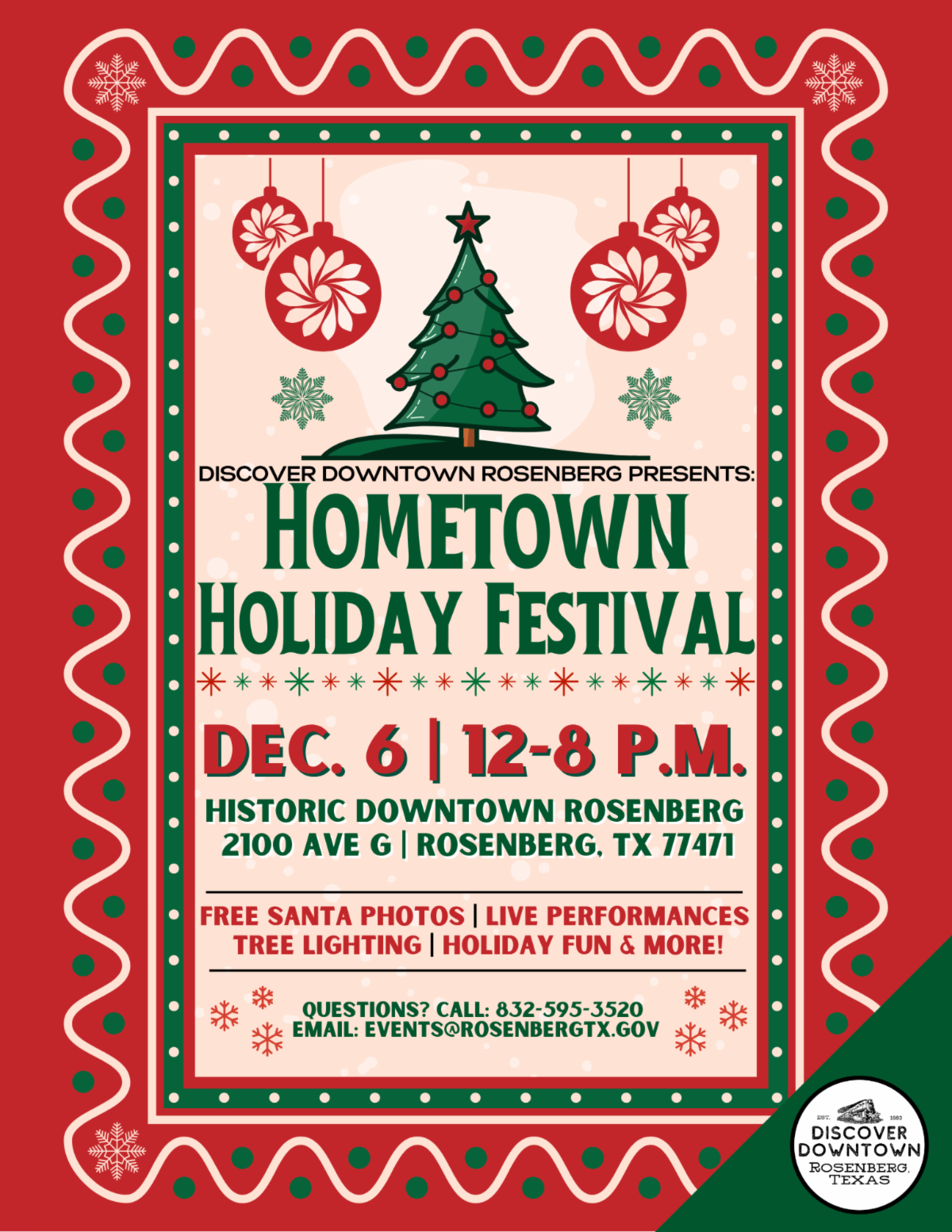 Discover Downtown Rosenberg reminds you to join the city of Rosenberg as we kick off the holiday season with the Hometown Holiday Festival on Saturday, Dec. 6 from 12-8 p.m. in Historic Downtown Rosenberg (2100 Ave G). The event is free and open to the public. A wide variety of food vendors, including our local downtown Rosenberg restaurants, will have delicious fares available for purchase.