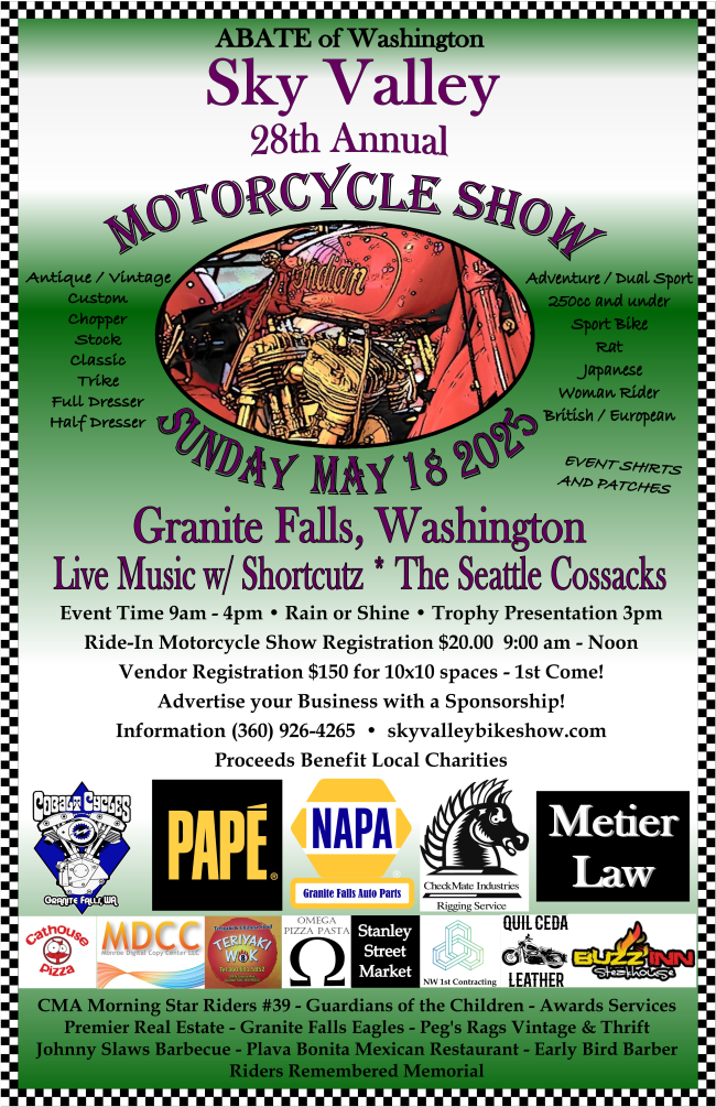 Sky Valley ABATE would like to thank everyone who attended and helped make our Shakin' the Winter Blues event a success. The Swap Meet was a great event and we'd like to thank Chris McAfee and her crew. The Chapter is preparing for our 28th Annual Motorcycle Show in Granite Falls on May 18th, 2025. We're still accepting Vendor applications and looking for Volunteers. If you're interested, please email skyvalleyabate@gmail.com. Hope to see you at the Show!
