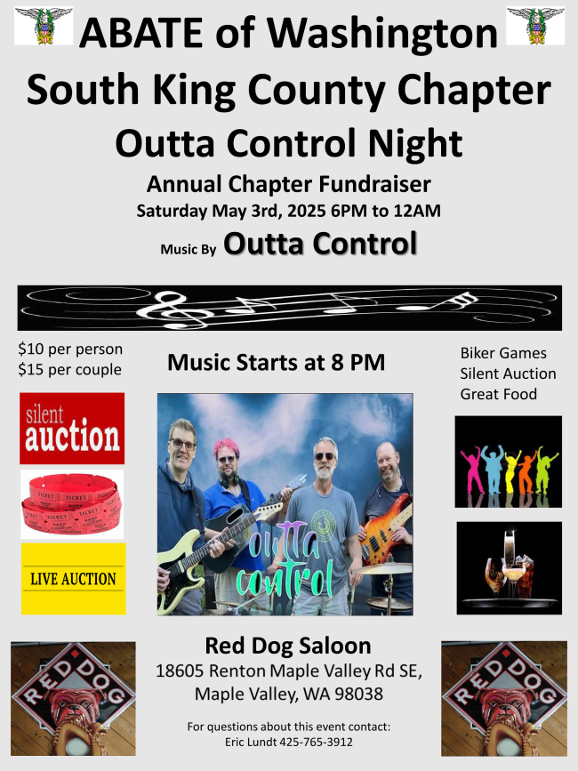 SKCC’s Fools Gold Run is now history and it was a good ride, we had great weather and a really nice turnout. Next up on May 3rd is our annual fund raiser “ Outta Control” being held at the Red Dog Saloon in Maple Valley. This is our big fund raiser for the year so come on down and enjoy some great music and while you’re here pick up an item or three at our silent auction. Good music, good food and great company!