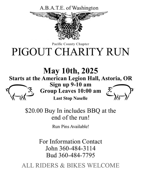 This year’s run will be a bit different, with no Ferry Ride in the middle. The Oscar B ferry is scheduled to be in dry dock during early May, so we will be riding to Longview to cross the Columbia River. As always, we will end up back in Naselle for a BBQ. We hope everybody can attend.
