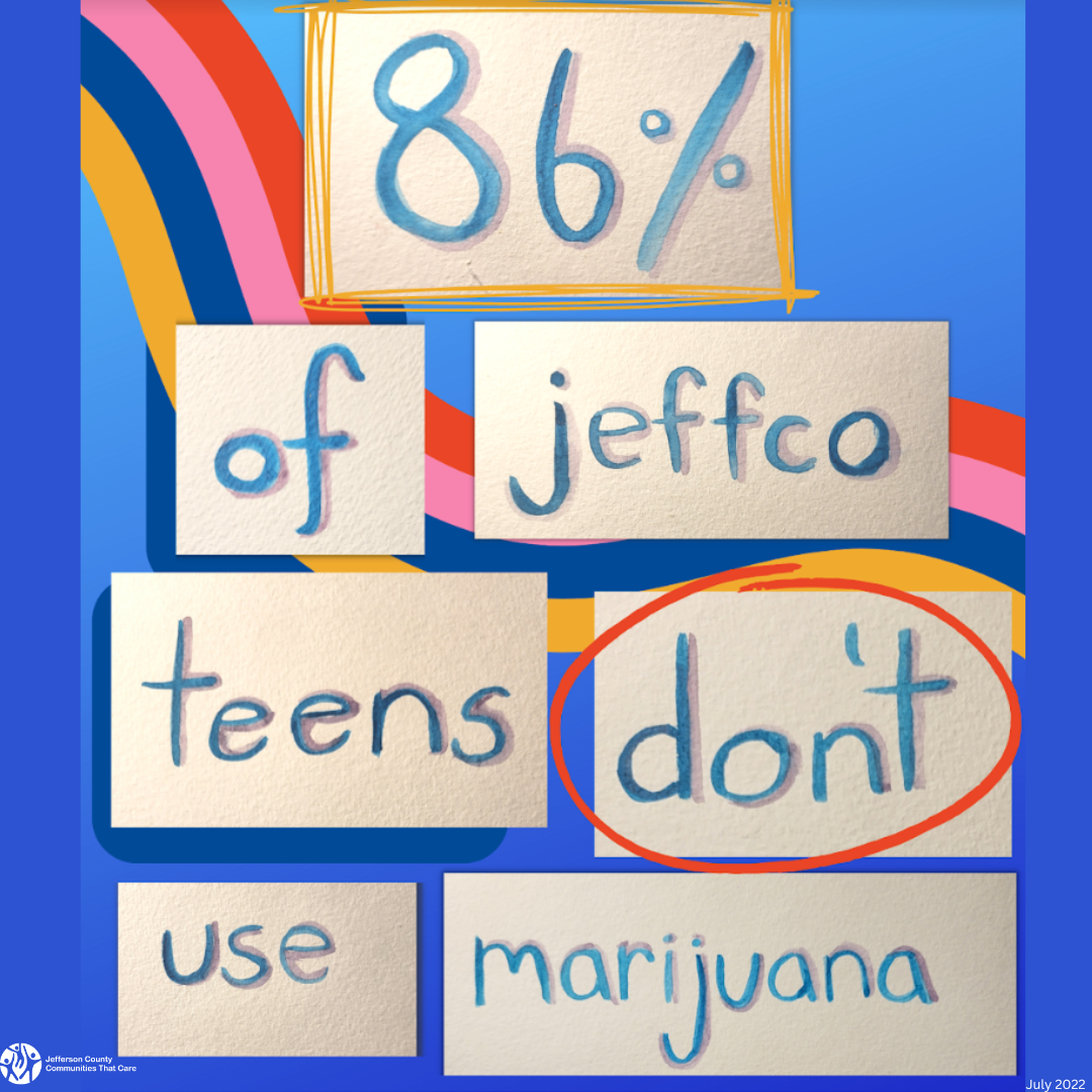 The good news? In Jefferson County, 86% of our teens are NOT using marijuana regularly, as shown in the poster created by local teens, below. Our teens need to know that not "everyone" uses marijuana.