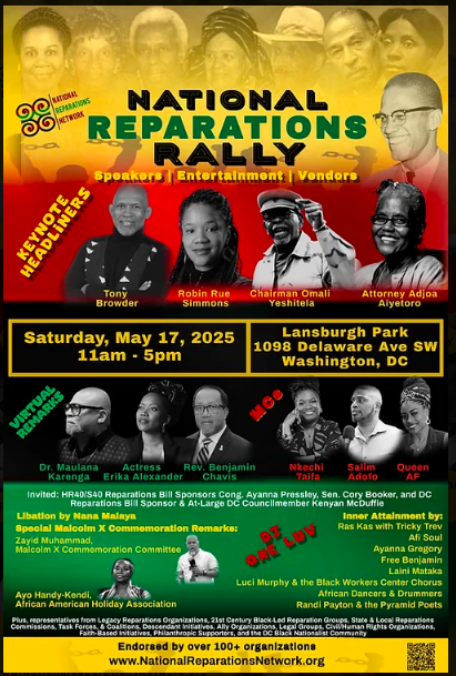 The National Reparations Rally is free and open to the public on Saturday, May 17, 2025, from 11 am to 5 pm at Lansburgh Park, 1098 Delaware Ave SW, Washington, DC. Additional information is available at https://www.nationalreparationsnetwork.org/.