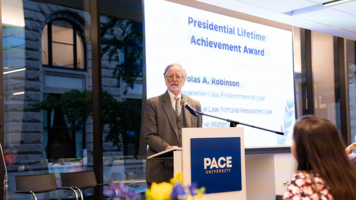 | | Nicholas A. Robinson, JD (Elisabeth Haub School of Law) was honored with Pace University’s prestigious Presidential Lifetime Achievement Award, recognizing his dedication to teaching, service, and scholarship, and his significant contributions to and impact on the University community. A pioneering figure in environmental law, Professor Robinson has been a distinguished member of the faculty at Haub Law since 1978. The award was presented during the 2025 Faculty Recognition Ceremony, held in the company of esteemed colleagues and peers. This honor is among many that reflect Professor Robinson’s extraordinary legacy. In 2009, Pace University conferred the prestigious position of University Professor for the Environment on Professor Robinson for his significant contribution to scholarship in the field of environmental law, both in the USA and abroad. He also holds the title of inaugural Gilbert and Sarah Kerlin Distinguished Professor of Environmental Law Emeritus. | | |