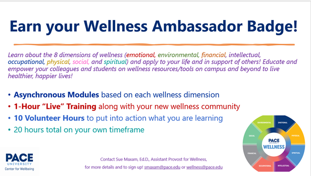 | | Lauren Whitman (Student Affairs) and Jimmy Luckman (LGBTQA Center) are hosting a Staff Run (or walk!) Club, on Friday June 6, 4:00 p.m., starting outside of 1 Pace Plaza…up the west side highway and looping back to campus for about 3 miles. You can walk or jog…whatever suits your fancy! Join in on the fun, connect with your colleagues, and enjoy all the benefits of getting/staying fit! | | Are you interested in learning about the 8 dimensions of wellness (Emotional, Emotional, Environmental, Financial, Intellectual, Physical, Social, and Spiritual) and how you can incorporate them into your own life while also acquiring (and using!) the tools to promote the wellbeing of others? Then consider earning our Wellness Ambassador Badge!There is one for staff/faculty and one for students. (Currently we have over 100 signed up and many who have completed it.) This program consists of 15 modules (done asynchronously on your own timeline) and service within the Pace community, all of which will take about 20 hours. | | |