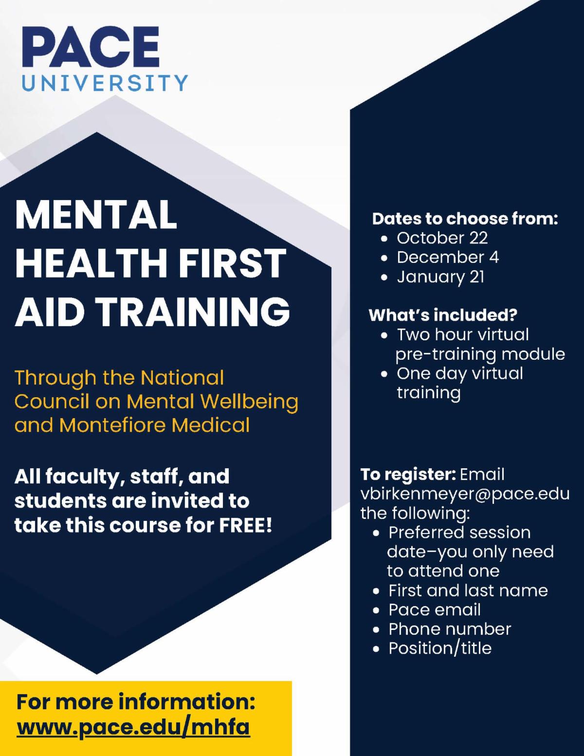 Pace is once again offering Mental Health First Aid Training to University faculty, staff, and students! Through a grant, Montefiore Hospital provides the training. The program is offered through the National Council for Mental Wellbeing and is presented virtually. Attendees complete a 2-hour pre-training module and then attend a live virtual course from 9:00 a.m.–4:30 p.m. with other Pace attendees. To learn more, please visit www.pace.edu/mhfa. Remaining spots are available in the following sessions: