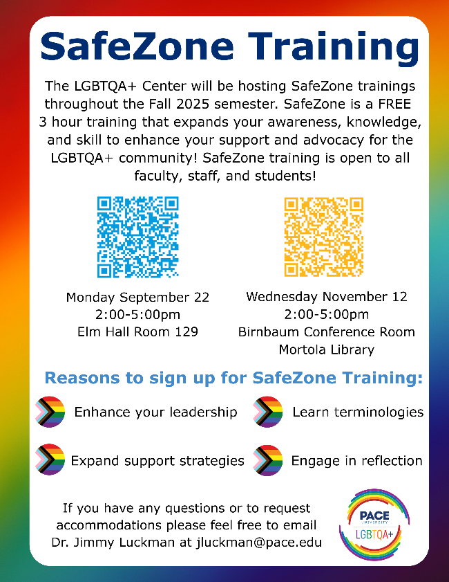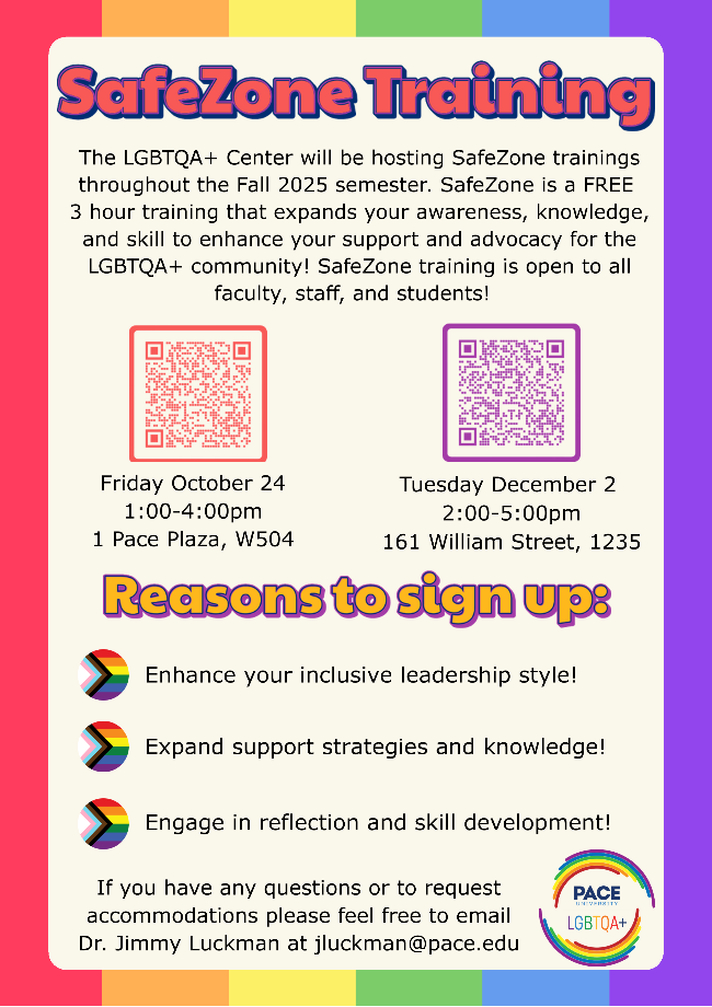 The LGBTQA+ Center will be hosting SafeZone trainings throughout the Fall 2025 semester. SafeZone is a FREE 3-hour training that expands your awareness, knowledge, and skill to enhance your support and advocacy for the LGBTQA+ community! SafeZone training is open to all faculty, staff, and students! The remaining sessions are as follows: NYC: October 24 and December 2; and PLV (for both Westchester campuses): November 12. Questions? Contact Dr. Jimmy Luckman at: jluckman@pace.edu