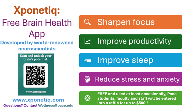 Through our ongoing partnership with the global MCN that President Krislov brought to Pace, we have a unique opportunity to participate in roll-out of a brand-new brain health app created by neuroscientists at Harvard and University of Texas Brain Health Center! Xponetiq helps sharpen one’s focus; decrease stress and anxiety levels; strengthen productivity; AND improve sleep. Download Xponetiq, a FREE brain health app in the App Store to get started! (Note: It works best with iPhone 12 & newer.) There’s even a raffle for the Pace community only that you can enter for up to $500 for those who use it!!