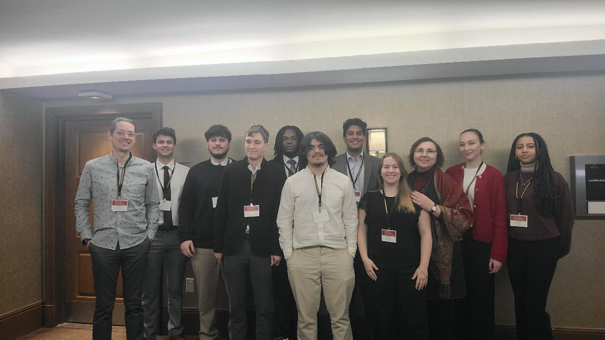 | | 24 students (both undergraduate and graduate) and 5 faculty members in the Economics Department presented their original research at the Eastern Economic Association (EEA) annual conference. This is one of the major conferences for professional economists in the United States, and such robust participation from the Department of Economics is a testament to the quality and importance of the work being done there. | | Left to right: Prof. Eric Osborne, Spencer Mehan, Thomas Dinopoulos, Charlie Rimmen, Ahmad Alexander, Joseph Sanfilippo, Suraj Sharma, Kristina Nasteva, Prof. Anna Shostya, Viktoriia Yevtushenko, Jada Lewis | | |