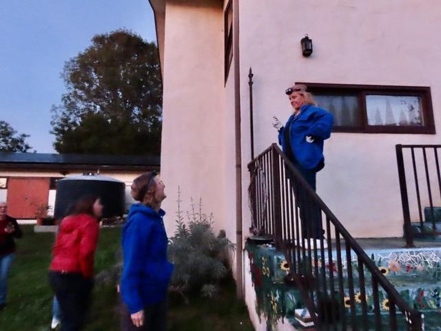 | | A bat meter captured two sets of Emery's vocalizations just before he took off. They were unlike any Hoary bat recordings we get when they are routinely hunting and navigating. | | Cindy and Chris getting ready to release Emery. Chris climbed to the stair landing to give some elevation to Emery’s launch. | | |