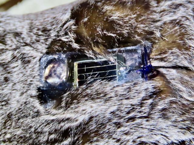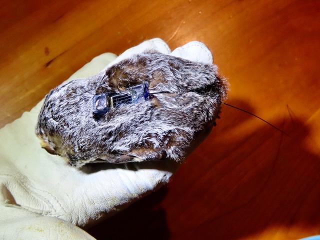 | | Close up of the rescued bat's fitted tracking device pictured above. At right you can see the transmitter's very thin black antenna. (photos by J. Cannon) | | | |