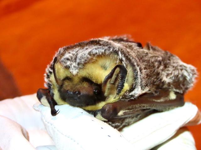 The rescued hoary bat's golden undercoat is on display in the photo at right (photo by J. Cannon), as well as his thick, silvery overcoat which keeps him warm.