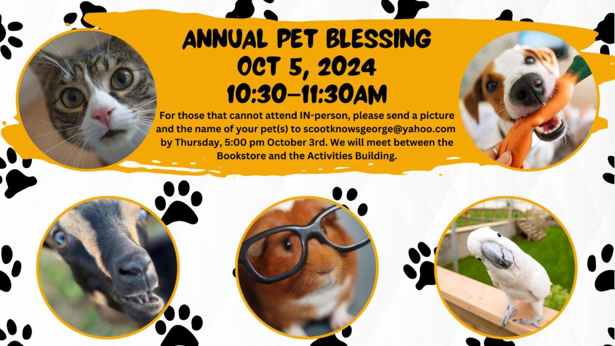 We celebrate all of creation, including our furry, feathered, and scaled friends, those with tails, and those without! In honor of St. Francis of Assisi, join us to bless your pet(s). For those that cannot attend IN-person, please send a picture and the name of your pet(s) to scootknowsgeorge@yahoo.com by Thursday, 5:00 pm October 3rd. We will meet between the Bookstore and the Activities Building.
