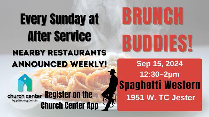 Join us after service for in-person Brunch Buddies, Sunday, September 15th, after service at Spaghetti Western, 1951 W. TC Jester.