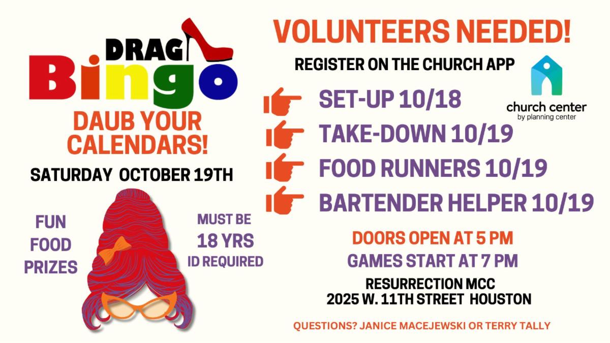 We need around 50 volunteers to make this event successful, The positions include set-up the day before (October 18th) and food and drink runners the day of the Drag Bingo event (October 19th).