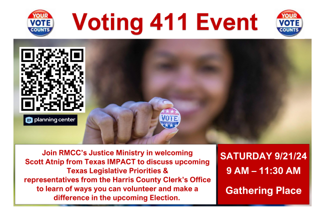 Join Resurrection’s Social Justice Ministry & Harris County Clerk's Election Office September 21, 2024, 9-11:30 am in the Gathering Place for an election education event to provide information relating to the Nov 5th 2024 Presidential Election. The presentation will provide information detailing what's on the ballot, discuss the importance of making a plan to vote, ways to ensure your mail in ballot is counted, teach participants how to operate the voting equipment and much more.