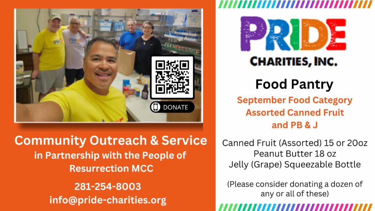 Pride Charities, our partner agency which operates the food pantry at Resurrection MCC, relies on donations and financial support for the food needed to help the 175 families we assist each month. Please consider picking up a few extra packs of Canned Fruit, Peanut Butter, Grape Jelly (Squeezable Bottle) or any of the items found on this list. We are pausing clothes donations. | |
