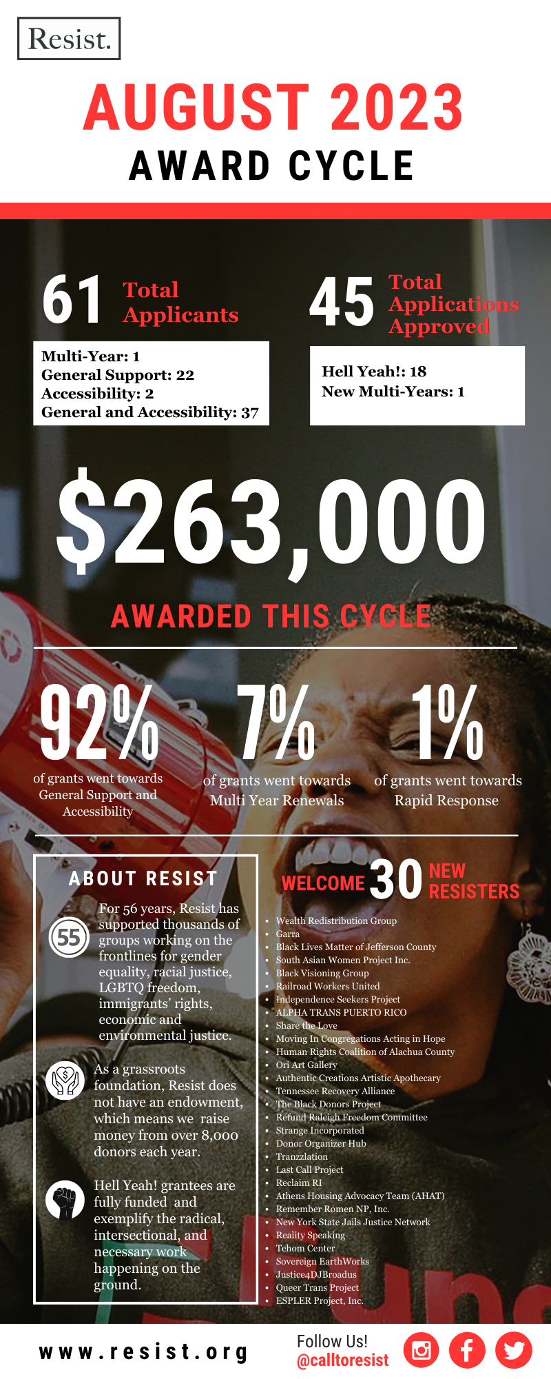 Resist is at a critical moment in our 56 year RESIST legacy. Though we are excited to announce that in 2023 alone we have redistributed $650,000 to radical grassroots organizations, Resist will not hold a November 2023 Grant Cycle.