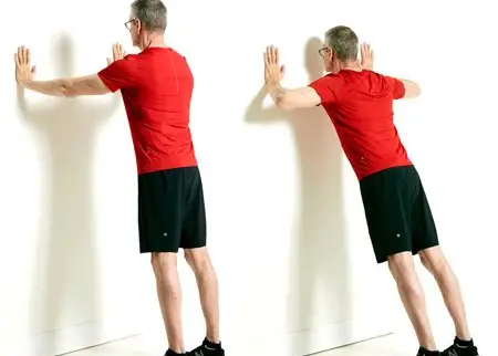 - Lean forward, bending your elbows to lower your chest toward the wall, then push back to the starting position.
