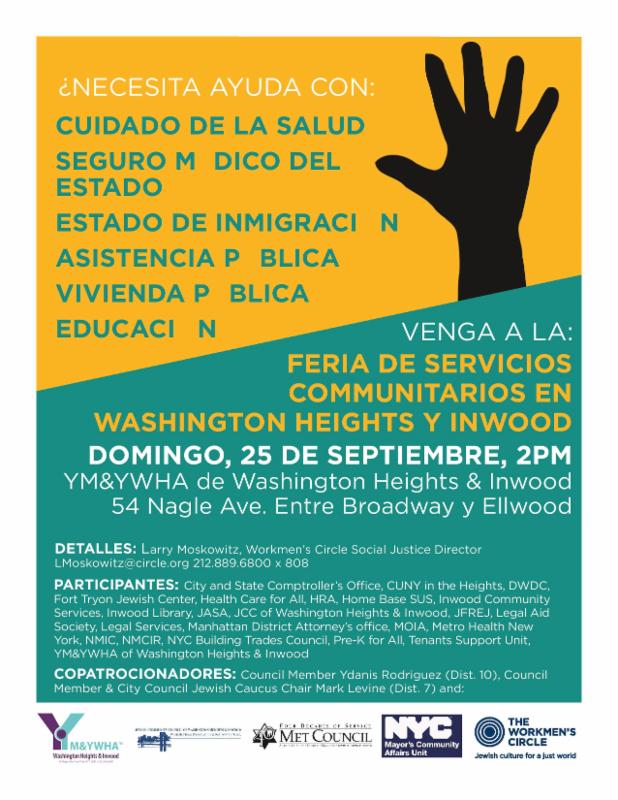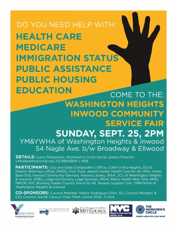 I wanted to send this friendly reminder that today from 2-5pm at the YM&YWHA Washington Heights and Inwood, I'll join many organizations in providing a wide range of services. I hope you can join us if you have any questions that need answering or concerns that you would like addressed.