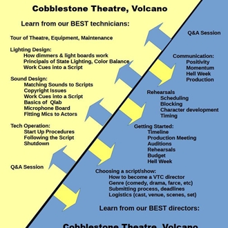 Come find out how FUN & REWARDING it is to support community theatre in Amador County. Join Volcano Theatre Co at the Cobblestone Theatre to hear Volcano Theatre Company’s most experienced technicians and directors talk about what they do best! Saturday is all about Tech! Sunday is all about Directing!