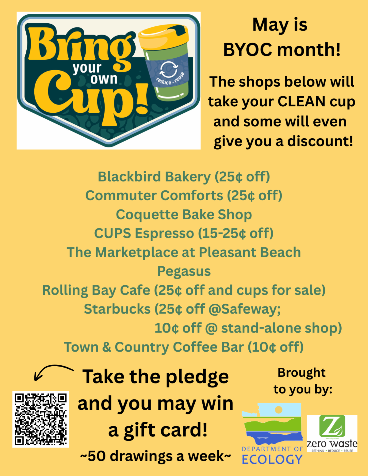 | | Create less waste AND have a a very good chance of winning a $25 gift certificate when you take the pledge to bring in your reusable cup for a drink fill-up. The coffee places above -- some of which offer discounts when you bring in your clean cup -- as well as these shops throughout the state are participating in this Department of Ecology reuse campaign. | | |