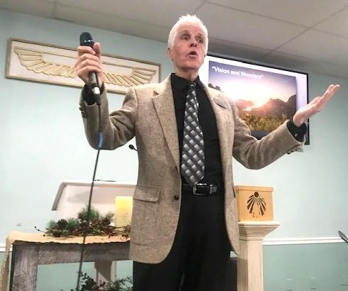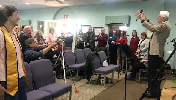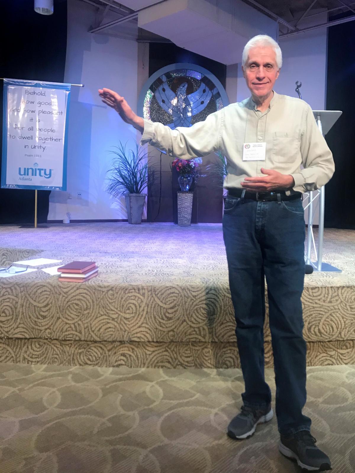 | | These 3 photos were taken January 19, 2020, shortly after Mike Davis signed his employment contract with our Board of Trustees and about the same time his agreement was formally approved by Unity Worldwide Ministries. On the far left is Mike's wife, Paula, and seated just right of Paula is Bob Sleczkowski, recording the service with his cell phone camera and tripod. Lined up against the side wall are 7 members of the choir. | | (Above left) Mike leads a service on Feb 16, 2020. On the right he is pictured at a leadership conference at the Unity Atlanta church on Feb 11, 2020. Mike led a training session on choirs and Music Ministry protocol. | |