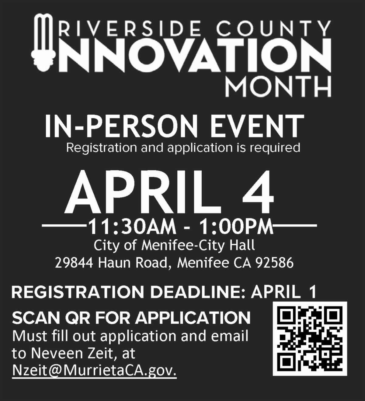 As part of Innovation Month, local startups will have the opportunity to deliver a 5-minute pitch before a panel of judges. Businesses located within the local area that are interested in entering can download an application form and email Neveen Zeit at Nzeit@MurrietaCA.Gov