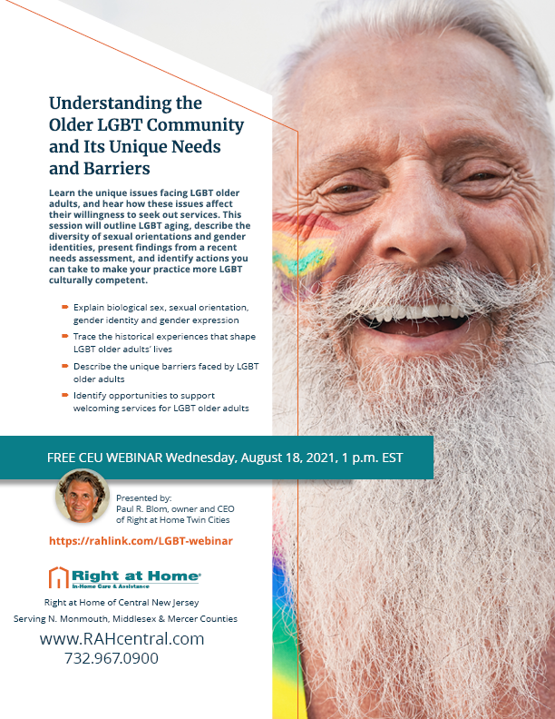 Please join Right at Home of Central New Jersey on Wednesday, August 18 at 1:00 pm EDT for a free CEU webinar on the unique issues facing older LGBT adults and how these issues affect their willingness to seek out services.