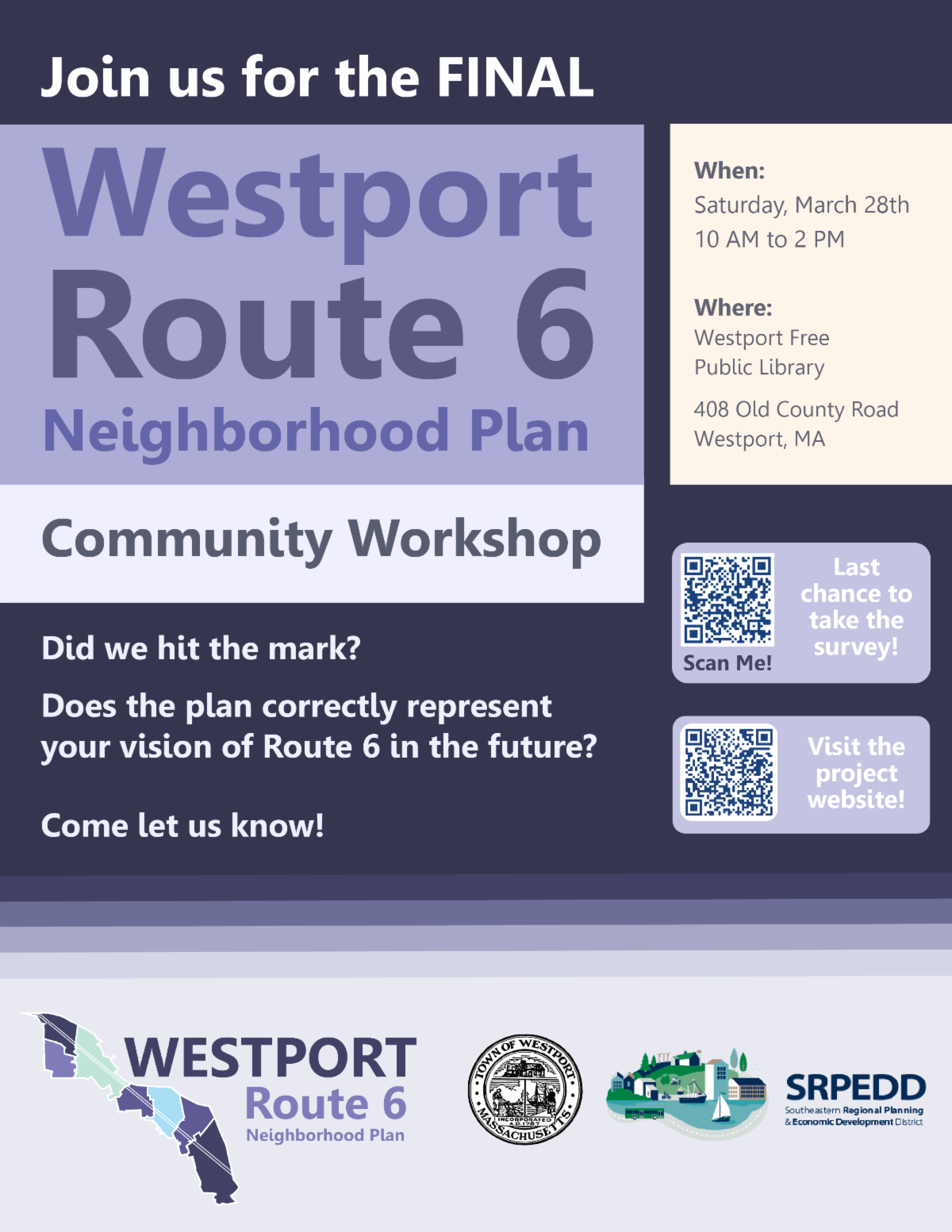 Westport wants to hear from YOU! The workshop will include a neighborhood plan for the Route 6 Corridor from the Fall River to Dartmouth borders. This plan will explore various opportunities for economic development, housing, and infill development, while also taking into consideration environmental concerns. Take the survey below to conribute: