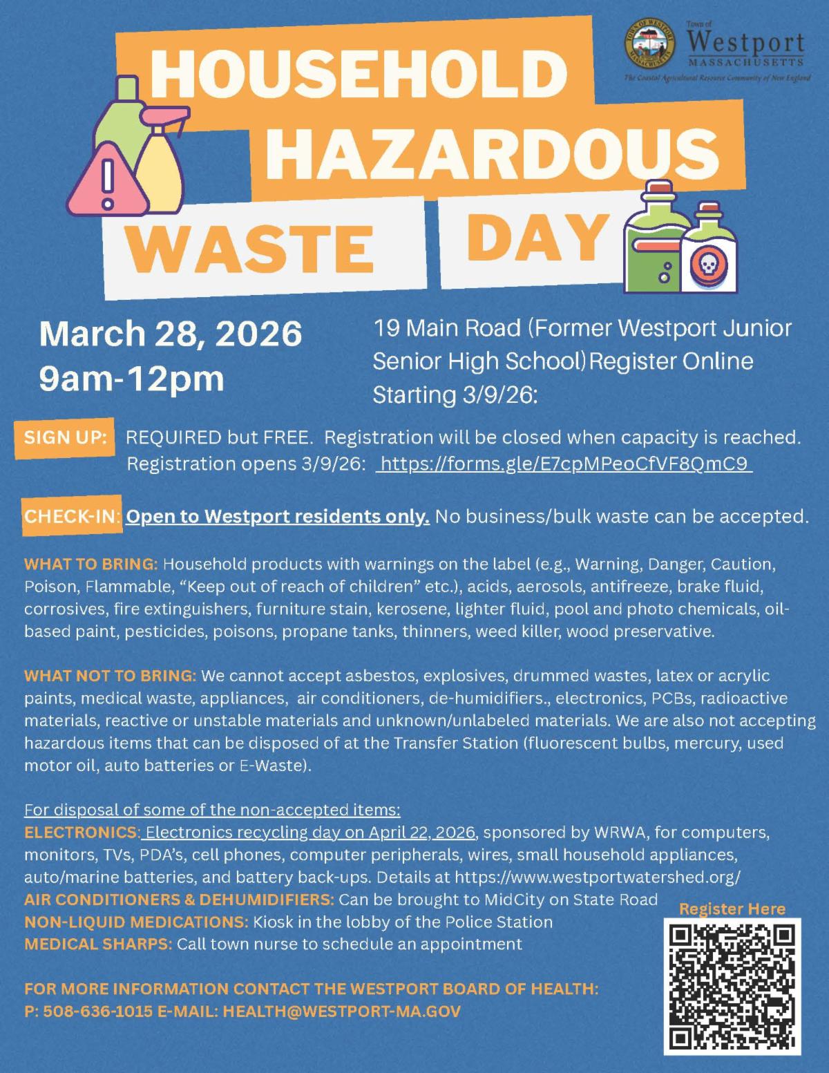 The Westport Board of Health will host a Household Hazardous Waste (HHW) Collection Day