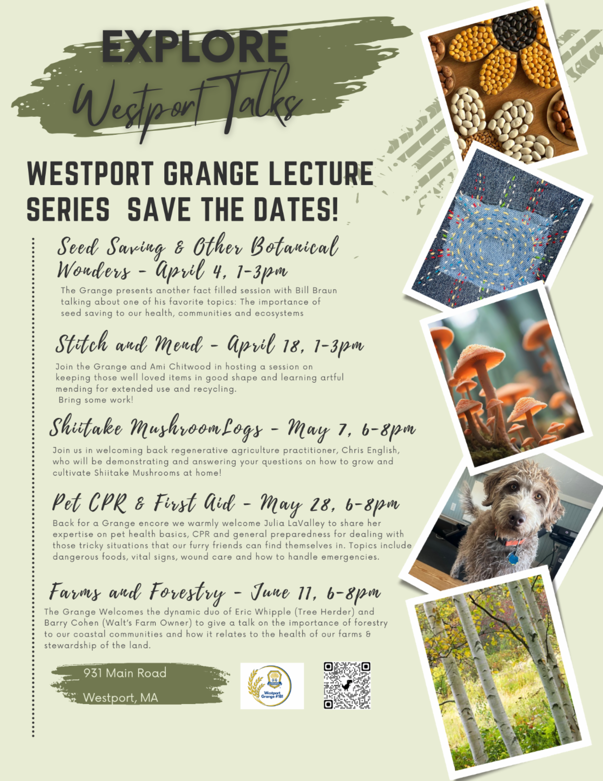 Join our local partners at Westport Grange for some upcoming and exciting classes from Seed Saving, Stich and Mend, Shiitake Mushroom Logs, Pet CPR & First Aid, and Farmers and Forestry. Click the link below to learn more about these creative and engaging workshops!