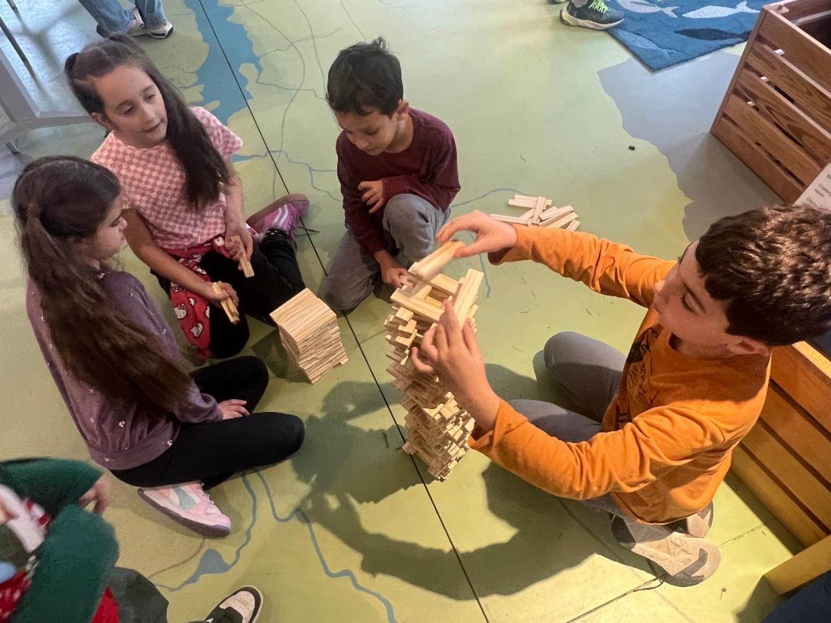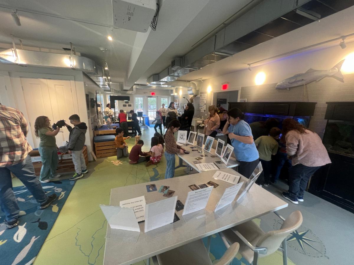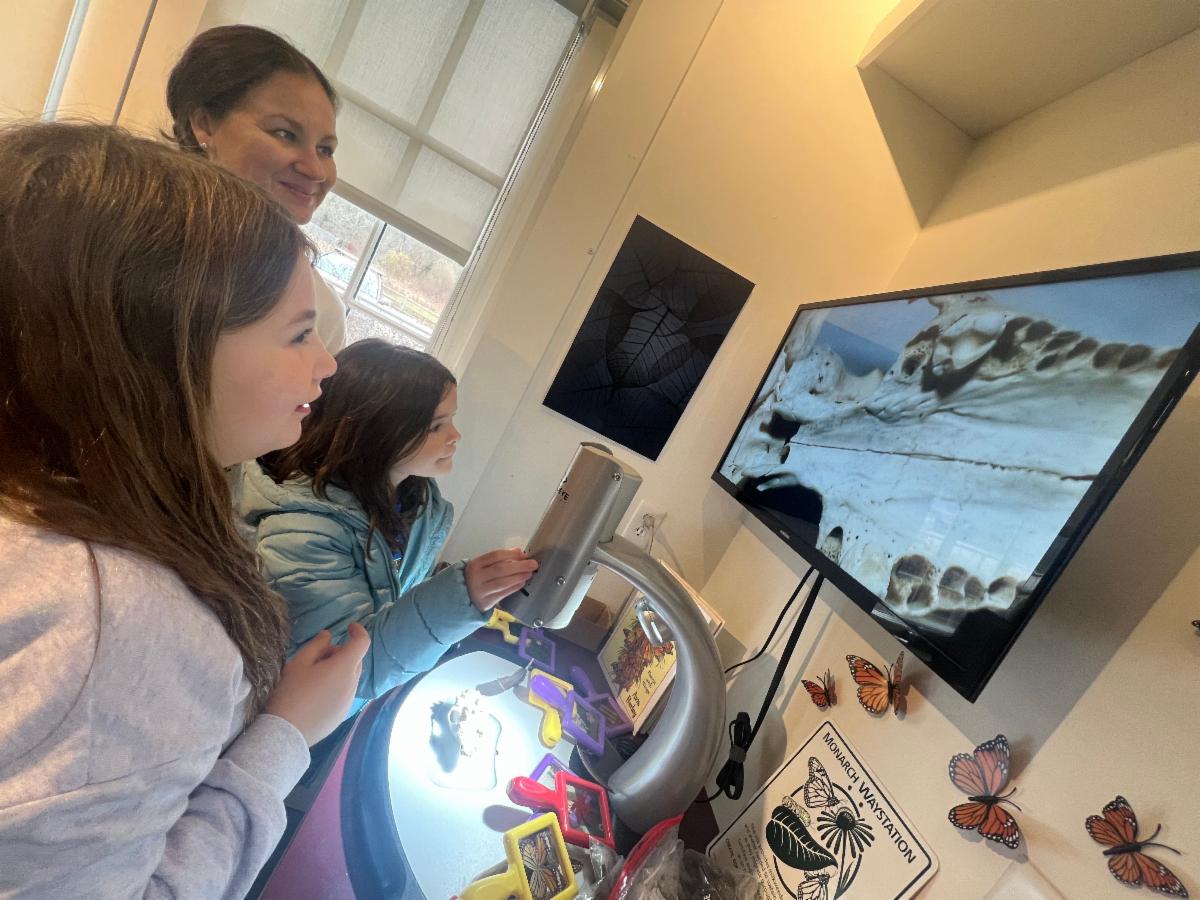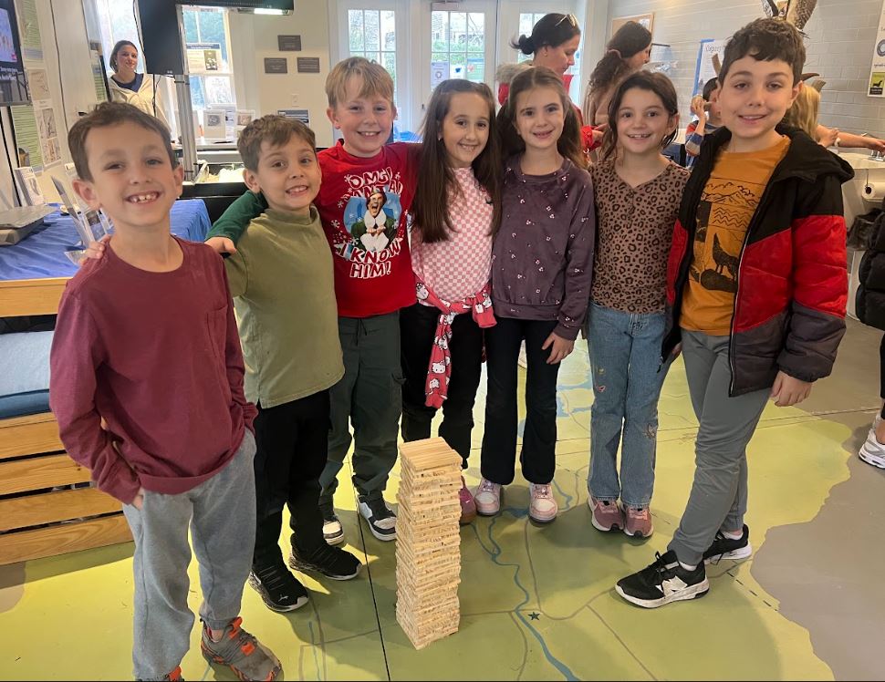 Most recently, we hosted third graders from Westport Elementary School for an animal-focused field trip. Students rotated through a series of hands-on learning stations: they listened for owl calls, unearthed fossils in the interactive sand table, searched for shells and fish in our aquariums, and used microscopes to investigate feathers, bones, and insects up close. They wrapped up their visit with a tower-building challenge to design a structure sturdy enough to support the weight of a robin’s nest.