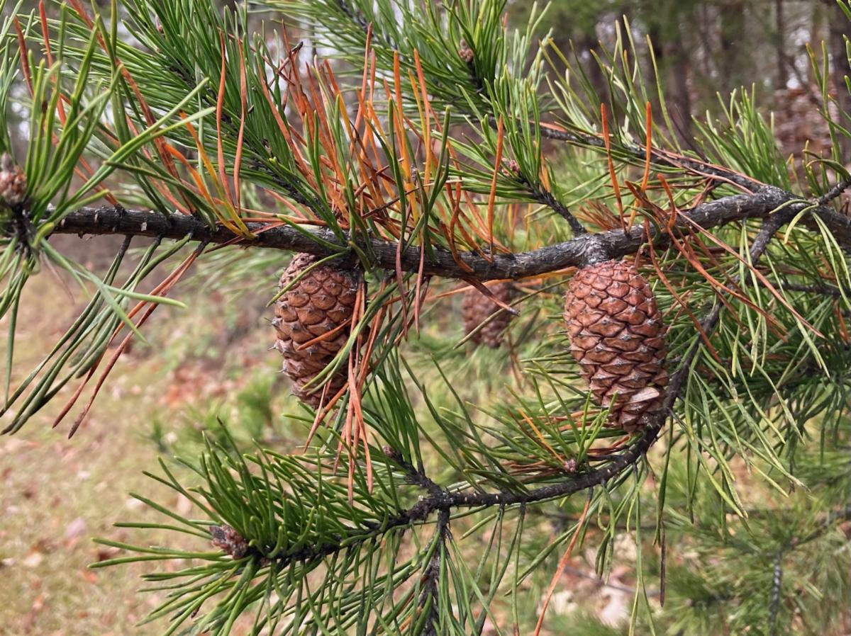 Virginia pines are also called scrub pines, due to their scraggly appearance. Despite their scrubby appearance, some of our big Virginia pine trees have become our canopy trees, reaching up to 60 feet tall. The needle-like leaves of Virginia pine are twisted, about 2 inches in length and grow in bundles or fascicles of two. The 2 needles look like the letter V and help to identify it. The small cones remain attached when open and have winged seeds that drop in the fall.