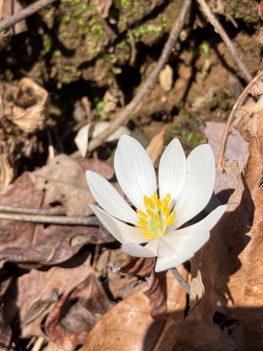Red maples are some of the first trees to flower. From a distance, you can see their red flowers before their leaves emerge. Some of my favorite early wildflowers are the trout lily, hepatica, trailing arbutus and bloodroot (pictured). Buckeyes are some of the first trees to leaf or green out.