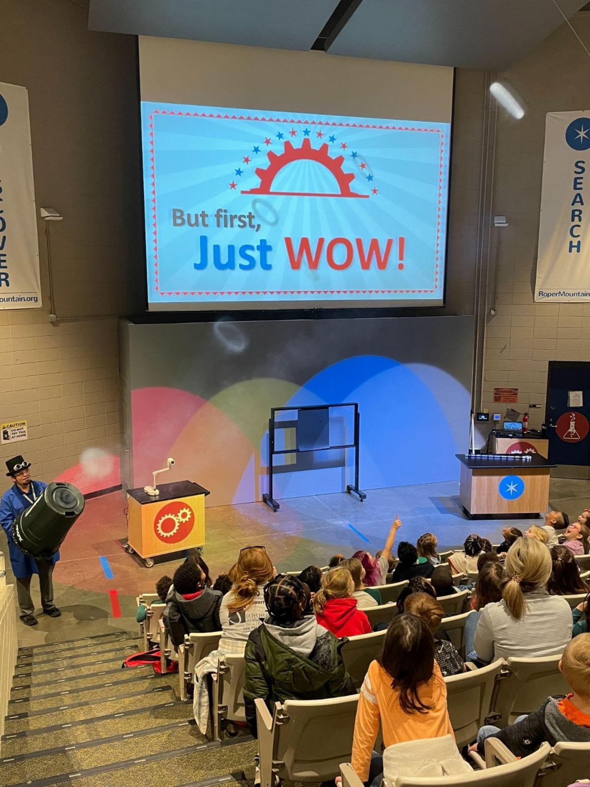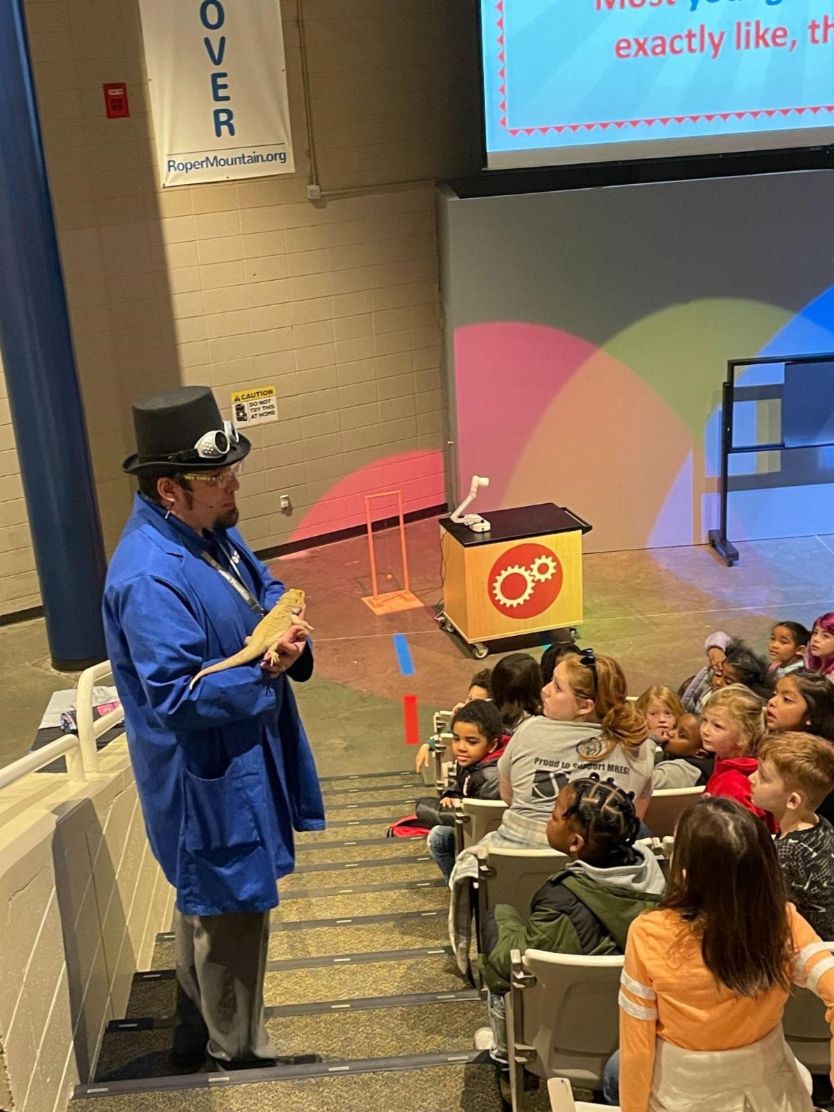 We have loved welcoming over 7,000 first graders for our new auditorium “WOW Wonder Show!” In this show, students experience all kinds of science wonders from fog rings to awesome light demonstrations which connect directly to their science standards in light, sound and animal behaviors. Elliot, one of Roper Mountain’s bearded dragons, has become a breakout star–but he has not let all of the attention go to his head.
