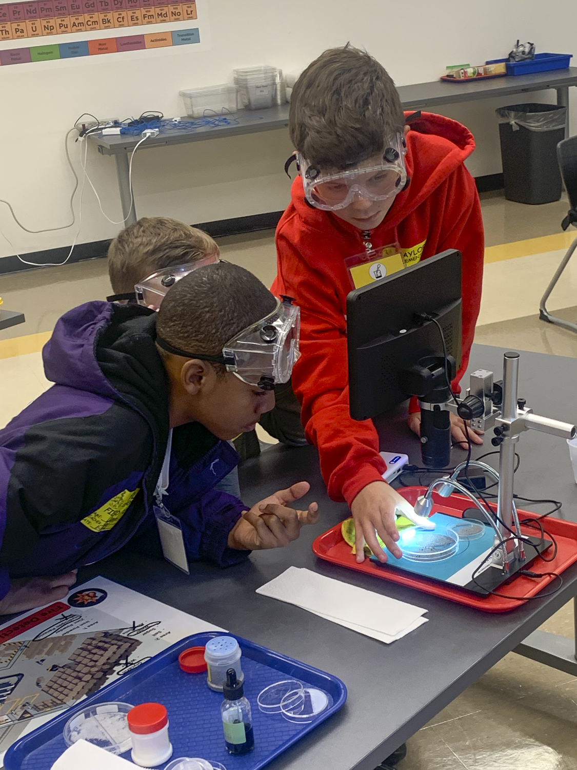 Thanks to the support of these Community Partners we are able to purchase cutting-edge technology like these microscopes used by 5th grade students in the Where’s the Matter? lab. Here, students are investigating the conservation of matter by observing different reactions to determine how matter changes and where it goes!