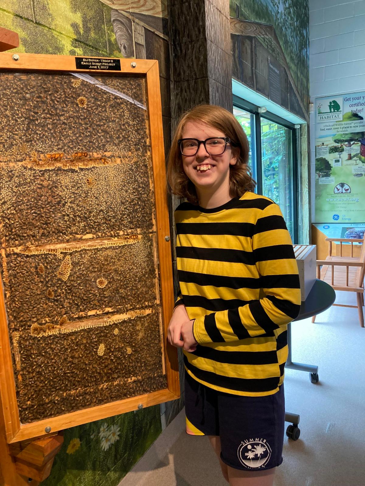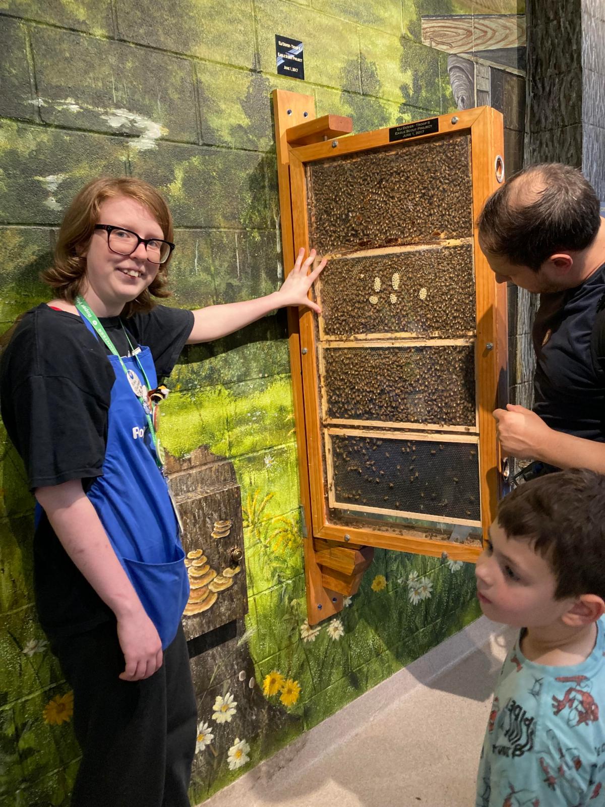Did you know that Roper Mountain has over 150 active volunteers!? We accept volunteers that are 14 years old and older, to help with a variety of roles and tasks. Most of our volunteers work with the public, during Afternoon Explorations and Summer Adventure. A lot of our young volunteers have been visiting Roper Mountain with their families since they were little and jump on the opportunity to "work" here once they turn 14. Robyn Hammond was no exception to this. Robyn immediately took a liking to our observational bee hive in the Ecology Lab. You can catch her, in her black and white striped shirt, creating quite the "buzz" around the thousands of bees that guests can view through the glass on the outside of the hive. | |