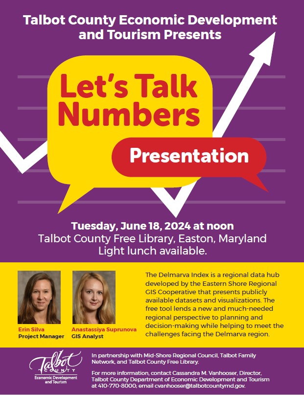 Project Manager Erin Silva and GIS Analyst Anastassiya Suprunova will give an overview of the Delmarva Index and how to use some of the datasets it includes. The program is sponsored by the Talbot County Department of Economic Development and Tourism in partnership with the Mid-Shore Regional Council, Talbot Family Network, and the Talbot County Free Library. Seating is limited and lunch will be provided.