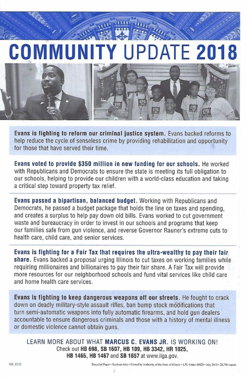 For the 100th General Assembly in the Illinois House of Representative, Rep. Evans is serving as the Chairman of the Transportation: Regulation, Roads & Bridges Committee. It is a fact that Illinois is one of the nations top states for transportation, whether it be freight rail, commuter rail, aviation, roads or bridges.