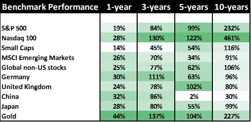 Finally, some commentators are pointing out that gold is a superior investment to stocks. Here are the actual numbers that show gold has done great, but not THAT great. You were much better off having an overweight in the Nasdaq technology index than owning gold.