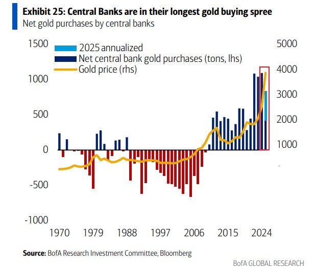 Figure 3: Central bank buying and selling of gold 1970-2025 (Bank of America)