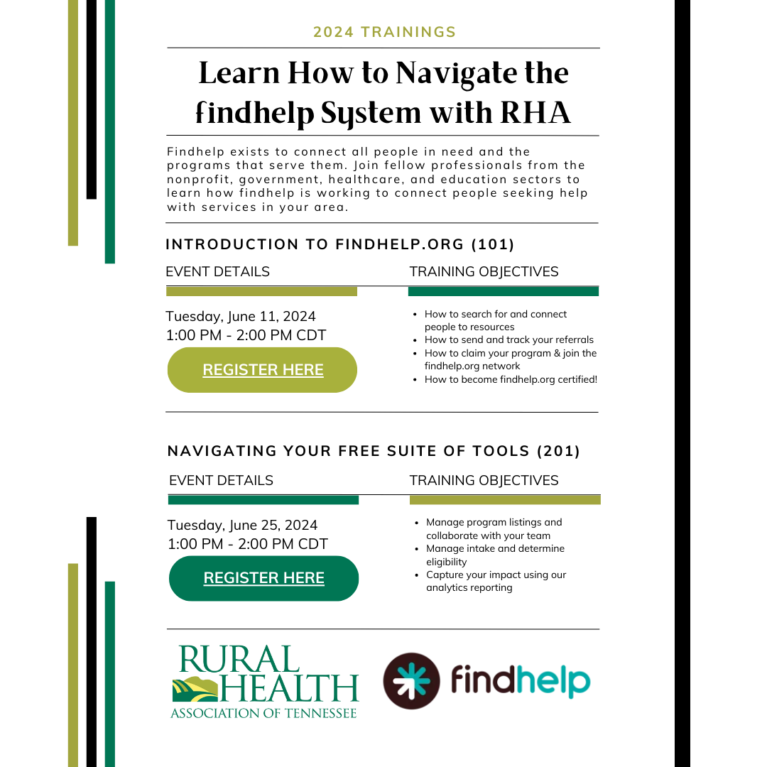 TennCare, findhelp.org, and the Rural Health Association of Tennessee are partnering to bring increased care coordination between nonprofits and healthcare providers. Each month RHA is hosting findhelp.org 101 and 201 training, open for anyone to attend. These two-part trainings will teach users how to navigate the findhelp.org website, make changes to your nonprofit's listings, and start connecting people with needed resources. For more information, click here.