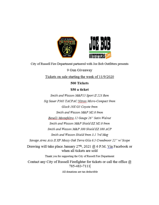 The City of Russell Fire Department is hosting a 9 Gun Giveaway to raise funds for the department. Tickets are $50 each. 500 total tickets are being sold.