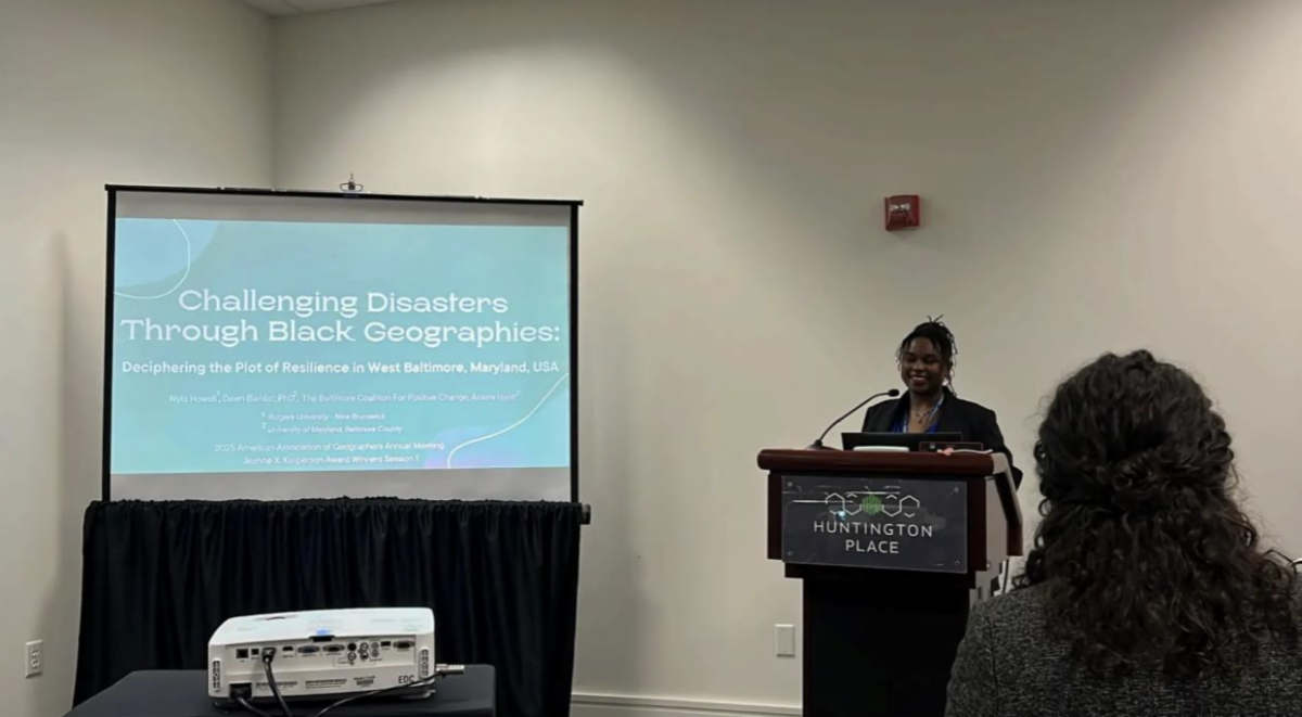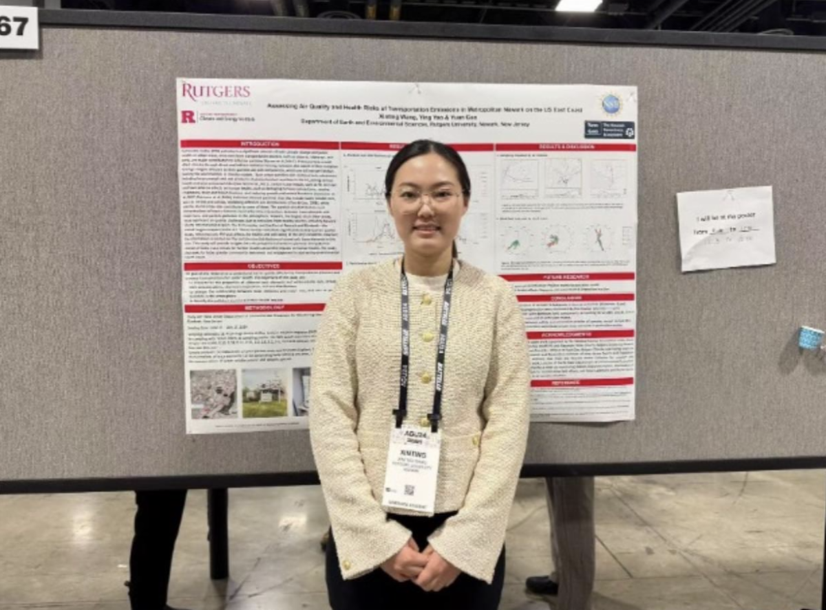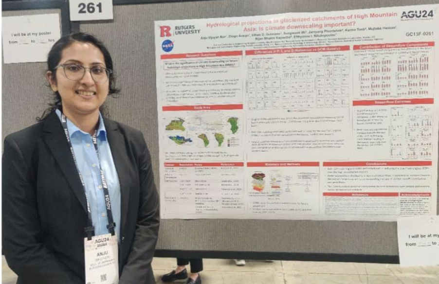 | Rutgers Graduate Student Support Program | | The RCEI Student Support Program enables graduate students to develop, conduct, and collaborate on climate and renewable energy scholarship and translate their research into real-world impacts. The support we provide from RCEI often is a ‘game changer’ for these students providing them a chance to showcase their scholarship and establish professional connections that will contribute to their success once they have completed their education at Rutgers University. Meet some of our most recent awardees and see the inspiring work these funds support. | | Xinting Wang, a Ph.D. Candidate, Earth & Environmental Science at Rutgers-Newark presents research on Assessing Air Quality and Health Risks of Transportation Emissions in Metropolitan Newark on the U.S. East Coast at the December 2024 American Geophysical Union Conference held in Washington, D.C. | | In March 2025, Nyla Howell, a Ph.D. Candidate in Geography, travelled to the American Association of Geographers meeting in Detroit. There Howell participated in two panels: 1) “Katrina at 20: The Possibility of Repair” and 2) the Jeanne X. Kasperson Graduate Student Paper Competition winners, speaking on how disasters, environmental hazards, and disaster preparedness are being redefined by a community in West Baltimore as an act of resistance to racial violence. | | Anju Vijayan Nair, a Ph.D. Candidate in Civil and Environmental Engineering, gave two presentations at AGU’s December 2024 conference: a poster (shown above) “Hydrological Projections in Glacierized Catchments of High Mountain Asia: Is Climate Downscaling Important?” and an oral presentation “Climate Change and Natural Hazards Affecting Livelihoods in High Mountain Asia”, which focused on understanding the impact of climate change on the local communities in High Mountain Asia, including heatwave risk. | |