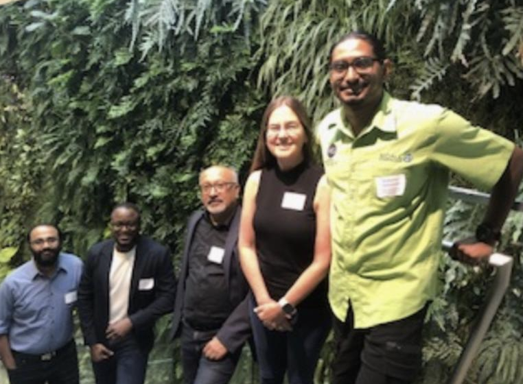 | | Collaborative Advances in Research on Seaweeds in the Caribbean | | Left to Right RCEI Affiliates, Shishir Chundawat, Kevon Rhiney, and Debashish Bhattacharya with guest speakers Loretta Roberson (The Bell Center Marine Biological Laboratory) and Romario Anderson (University of the West Indies-Mona) at the RCEI Caribbean Seaweed Research Symposium. | | |